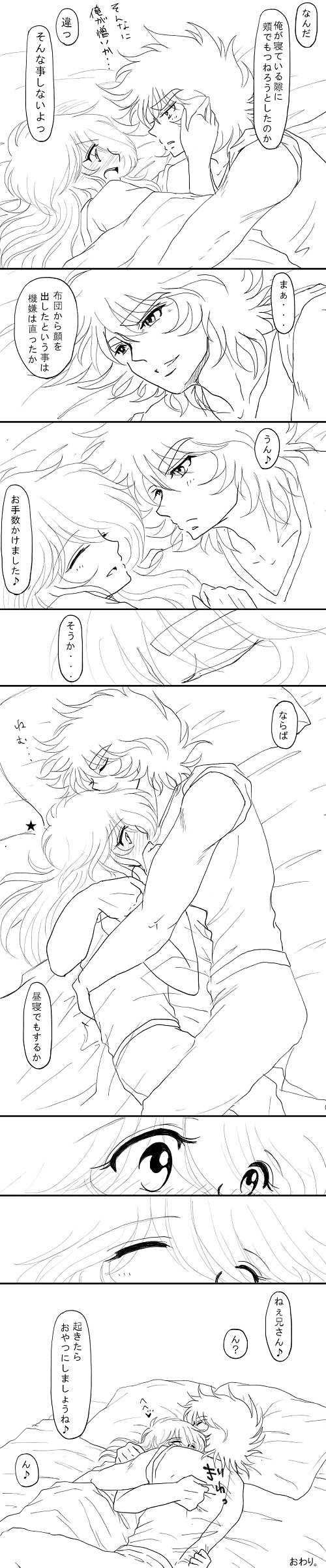 そして私と兄は考えた。その①の4 ご来訪・拍手ありがとうございます。気づけば10月・・・。多忙でしばらくお留守にしてました・・・(:へ;)スミマセンブログの更新ぐらいしたいなぁ・・・とか思いながらも気分が乗らず、空いた時間はこそこそと一輝瞬を描いておりました(^^;)来週までは少しゆとりができそうなので、いろいろと更新していきたいなと思います^^*マイペースな感じではありますが、今月もどうぞよろしくお願いしまいっきしゅん≧ω≦!!というわけで。ずっとこちらでアップしていた拗ね拗ね瞬ちゃんと兄さんの最後の頁をアップします^^*よろしければお付き合いくださいませ♪ 一旦たたみます。 ・・・相変わらずな我が家のいちゃこら一輝瞬な終わり方なんですけれども・・・wwwご機嫌が治った途端に兄さんの抱き枕になっちゃう瞬ちゃん・・・( *´艸`)♡へへへでも、兄さんにギューーーーーって抱きしめてもらえて。一輝兄さんの愛情とか優しさとか温もりとかを感じて一番嬉しいのは瞬ちゃんだろうな~♪って思います//ω//♪普段一緒にいない兄さんだから、一緒にいる事も、お昼寝をする事も瞬くんにとってはどんなにも嬉しい事だし、それが兄さんの愛情たっぷり感じられるなら、なおさら瞬ちゃんにとっては幸せいっぱいだろうなって思うんです♪そんな幸せいっぱいに満ちた嬉しそうな瞬ちゃんを考えると、私も心ホクホクになっちゃいます^^*そして、兄さんも!!渋くてカッコイイながらにちゃっかりと瞬くんをぎゅーーーっと抱きしめちゃってもう・・・///そうやって瞬くんの温もりを感じて兄さんもまた安心感を覚えたりするんですよね・・・≧///≦・・・ムッツリ兄さんめ・・・っっ☆.。.:*(嬉´Д`嬉).。.:*☆←満面の笑みwwwまぁ・・・安定なる我が家の一輝瞬ですけど。そんな幸せいちゃこら一輝瞬が大好きですっっ☆.。.:*(嬉´Д`嬉).。.:*☆ホントは同じ始まりのシチュでもう2つ描きたい一輝瞬があって途中までラフ描いてたりするんですけれど。ちょっと他にも描きたい衝動がとまなくて描きたい漫画とかイラストとかあってフラフラとそちらに手を付けちゃったもので・・・≧▽≦;また落ち着いたら描きたいなと思います♪もしかしたら描く描く詐欺で終わるかもだけど・・・・^^;描いた時はまたお付き合い頂ければ光栄です♪どぞどぞよろしくお願いします♪そして最後に。長々と小分けアップでしたが、お付き合い頂きましてありがとうございました♪♪ [6回]PR
