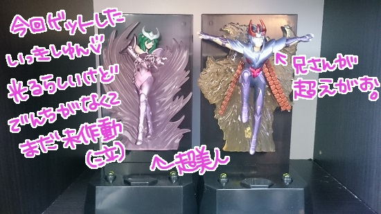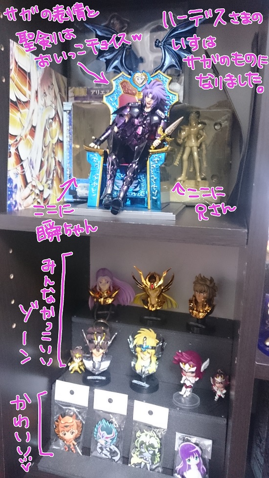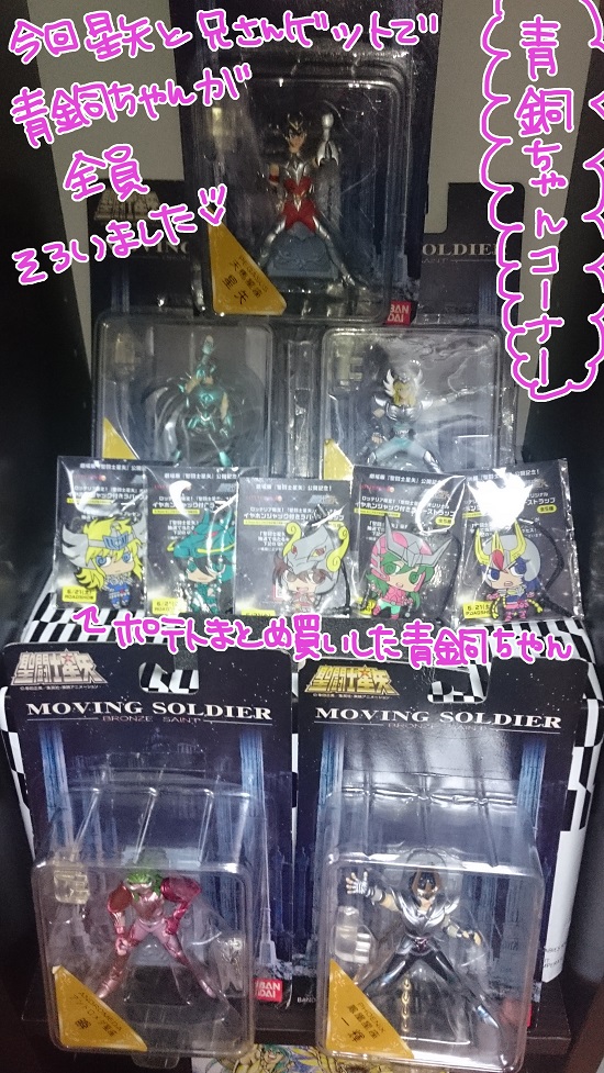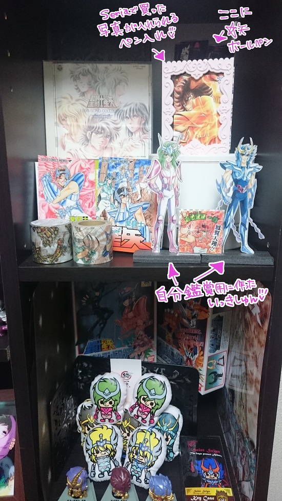 ようこそ我が家へ! ご来訪・拍手ありがとうございます。前回のブログにてお話していた週末ショッピングでゲットした瞬ちゃんに注文していた☆矢アイテムが届きましたっっ(≧ω≦) みんな!!ようこそ我が家へっっ!!(≧▽≦)ノ☆一旦たたみます。 今回のアイテムとこの1年間で少しずつ買っていたアイテムと併せてボリュームも増えたので久しぶりに部屋の☆矢棚を再整備しました(*^^*)100均で買っていた工作ボードを切ったりくっつけたりしてミニ棚も作成してがんばりましたよ!というわけで朧さんちの☆矢棚!レベルアーーーーーップ!! 前よりもごちゃごちゃしていますwそしてこの棚の中で注目なのはココ!いっきしゅんコーナー(≧▽≦)ノいぇい♪ 一輝瞬兄弟による一輝瞬兄弟のための一輝瞬コーナー♪一輝兄さんの両手に瞬ちゃん( *´艸`)ふふふ♪もうね・・・小宇宙滾る♪私の中で神棚です♪毎日拝まねばっ(//▽//)人☆☆見えにくいんですけど一番上にある兄弟は今回ゲットしたアイテムなんですが、光るらしいんですよ♪ ↑に書いてるごとく我が家に電池が今ないので早々に買ってきて光らせたいと思います(:▽;)あとね、瞬ちゃんは超べっぴんさんなのに!この一輝兄さんがびっくりするぐらいに超笑顔なんですよ!!何がそんなに楽しいの!?兄さん!!??っていうぐらいの笑顔なんです(:▽;)もし見る機会があったら手に取って見てもらえたらと思います。ロー〇ンのCMばりに超笑顔ですから~!。・゚・(ノД`)・゚・。 うえええんそして神棚の他の棚はこんな感じ(*^ω^*)いくつかアップ♪ だいぶ賑やかになりました( *´艸`)♪とはいえ、まだまだ欲しいアイテムもいっぱいなのでこれからも地道にぼちぼちと集めて行きたいなと思いますっ(≧ω≦)ちなみに私のデスク周りもにぎやかですw いい歳してなにやってんのって言われそうですがwでも好きなものに囲まれるとそれだけで元気がでますよね♪♪毎日の活力にしていきたいなと思いますっ(≧ω≦)そういえばこないだ初めて☆矢マンチョコを買いました♪ホント今頃か?な話なんですがw近所のセブン2店舗にまだたんもりと残ってまして、久々に甘い物食べようかなと1個買ってみました(*^ω^*)そしたらですよ!!なんと兄さんが引けましたーーーーーーーー(≧////≦)☆なんていう奇跡!! もともとクジ運がないほうなので、全然期待してなかっただけにとっても嬉しかったです!!一輝兄さん!我が家にようこそ!!こうなると瞬ちゃんが欲しくなってきますよね(≧////≦;)欲しくはなるけどきっと次は奇跡が起きないだろうし・・・悩ましいところですwww・・・多分きっと買いますよ私←買うんだwww奇跡と言えば、GW最終日にも奇跡が起きました♪朝起きると女神が降臨されてですねっっ!!そして☆矢ショップに行くのでおつかいしますよ♪との神の声が!!!!!なんていう優しきアテナ様・・・・。・゚・(ノ∀`)・゚・。うぉーん完全にあきらめてたのでまさかの出来事に本気で感動の車田泣き(:▽;)ありがたく図々しくもお言葉に甘えてお願いしました(≧///≦)というわけで近日中に☆矢ショップのアイテムがようこそ我が家へ!になりそうです(≧///≦)その時はまたこっそりと感動の車田泣きしながら語らせてくださいませ。どぞどぞよろしくお願いします♪最後に頂きましたメッセージのお返事をこちらのコメント欄にてお返事させていただきました( *´艸`)♡コメントありがとうございました( *´艸`)♡ [5回]PR
