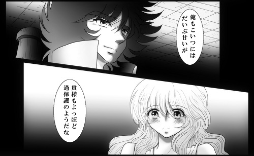 キリ番漫画☆ ご来訪・拍手ありがとうございます。TOPページにも案内してますが、先日のキリ番でお贈りさせて頂いた漫画をアップしました。進捗が良ければ完成形でアップしようとしたのですが・・・進捗が悪くて:▽;まだまだ時間かかりそうだったので、先日のキリ番でお贈りした所までをアップしました≧≦途中まででも読んでいいよ~っていうアテナ様がいらっしゃいましたら、お付き合い頂ければ幸いです^^*いやいや、読むなら完成形ででしょ。って方はもうしばしお待ちいただけたら幸いです^^どぞどぞよろしくお願いします^^*まだ途中ではあるのですが、キリのいい所までアップしたので、キリ番漫画について語らせてくださいませ≧///≦;一旦たたみます^^* 今回の漫画。アンドロメダと兄さんが問答するお話だったんですけれども・・・^^*なんていうか、瞬くんは兄さんにもアンドロメダにも大事にされてるねっていうおはなし^^* アンドロメダが瞬くんの事を思って、皆と引き離そうとしたんですけど。それはアンドロメダの本意とするところではなくて。本当はアンドロメダの神話のお話では生贄になるけどペルセウスが助けに来てくれて、その後2人幸せに暮らすんですよね。なので、お話の中でアンドロメダが言っていた「命を落とす」と言ってたけど、あれは方便なわけで・・・。アンドロメダ自身がペルセウスが守ってくれたように主である瞬くんにもペルセウスのような守ってくれる人を探してたんじゃないかな・・・と。それは誰でもなく、瞬くんにとって大切な存在の人である兄さんであってほしかったわけで・・・^^*だからと言って、強制では意味もないもの。でも、兄さんは瞬くんの事が何よりも一番大切で、自分の命代えても守ろうとするその本心が聞けて、アンドロメダも安心したし、嬉しかったんじゃないかなって思います( *´艸`)♪それと今回アンドロメダを擬人化しちゃったんですど。描きはじめ当初はオブジェ形態だけの予定だったんですよ。なんですけど。『過保護な兄さんに過保護扱いされるアンドロメダ』ていうのがどうしても描きたくて、予定変更で擬人化しちゃいました( *´艸`)www それにしても、兄さん自分で自分が過保護だってよくわかってらっしゃるwwwそして兄さんも。瞬くんを引き離されればされるほどに、ヒートアップしていく兄さんたらもう( *´艸`)www しかもヒートアップしすぎてアンドロメダに瞬くんの存在が家族以上であることを言っちゃうとか・・・描いてて一人ニヨニヨしちゃいました( *´ω`)もう兄さんたらwwwそんな兄さんが好きなんですけどね( *´艸`)wwwそして、兄さんは知る事はないけれど。一緒にいる時も。いない時も。瞬くんが頑張れる源は兄さんなんだよっていう・・・そんな健気な瞬ちゃんも好きです^^*瞬くんが生まれてきた時から、ずっと守り、共に戦ってきた兄さん。そして。聖衣を手にした時から、兄さんが居る時も居ない時も、ずっと瞬くんの側で共に戦い、守ってきたアンドロメダ。瞬くんを大事に思う、そんな二人の優しさが少しでも伝わったなら幸いです^^*お話の残りは、瞬くんが目覚めてからの・・・相変わらずな兄さんと瞬くんの仲良しシーン^^* 無くてもいいシーンなのかもしれないけれど。やっぱり兄さんと瞬くんが仲良しこよししてるシーンは描かないと私の気が済まないもので^^;進捗悪いですが、完成目指して描いて行こうと思うので、完成しましたらまた付き合ってくださると幸いです^^*どぞどぞよろしくお願いします♪そして長々とお付き合いありがとうございました♪最後に頂きました拍手コメントのお返事をこちらのコメント欄にてお返事させていただきました( *´艸`)♡コメントありがとうございました( *´艸`)♡ [10回]PR