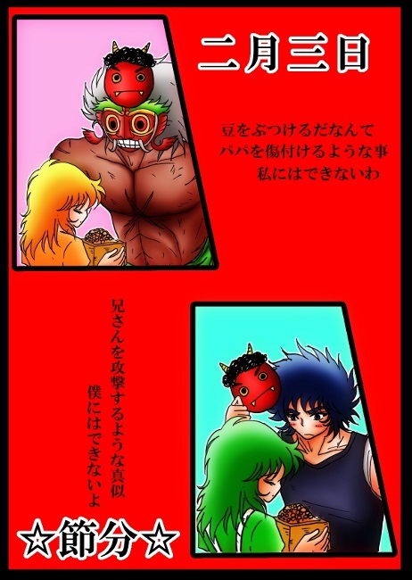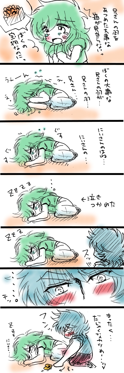 リアル宝探し☆ ご来訪・拍手ありがとうございます。Topページにて案内しておりますが、日頃お世話になっているアテナ様のお誕生日のお祝い絵をGallery005にアップしました(*^^*)今回もめちゃめちゃ遅くなってしまったのですが・・・orz(再ジャンピング土下座)かま様♪お誕生日おめでとうございましたっっ!(pq´∀`)┌iiiiii┐(´∀`pq)パチパチこの一年が素敵な一年になりますように♪♪Galleryにも書いてるのですが、かま様の描かれる龍瞬も大好きなのですが、Ωっ子ちゃんに愛されている瞬さんも大好きで、そんなみんなの瞬先生&Ωっ子ちゃんでお祝いさせて頂きました(*^^*) 瞬「ちょっと!今日は貴鬼たちの健康診断に来たんだけどっっ!」光牙「そんなの後ででいいよっ!みんなで遊ぼうぜっ!」瞬「だから仕事中だって・・・!」ユナ「ほら♪行きましょう!瞬さんっ♪」瞬「だからっ・・・」龍峰「瞬さん♪行きましょうっっ♪」って、強制連行される瞬先生・・・( *´艸`)w無印でも、Ωでも瞬ちゃんは皆に愛される存在だと思います(*^^*)お祝い絵で妄想膨らますなと言われそうですが・・・(>///<;)スミマセンかま様♪お誕生日おめでとうございましたっ♪♪そしてそして。タイトルにありますが、リアル宝探し。一旦たたみます(*^^*) とある冊子の記事に載っていた【全国のリアル宝探し】の記事を読んでたのですが。東京は浅草にある【花やしき】というテーマパークにある『カラクリ屋敷】というリアル宝探しのアトラクション。ここのお宝が、なんと『鳳凰の羽』らしいんですっっ(≧ω≦)☆なになに!!?一輝兄さんの羽を探すアトラクションですとっっ!!かなり興味があるんですけれどっ!!ちょっと、ちょっと!!「兄さんどこにいるの??」って瞬くんの気持ちになって探したらものすごく楽しそうじゃないですかっっ(≧▽≦)♪兄さんの小宇宙を探りながら探す旅ですねっ!!(←旅でもなければ一般庶民に小宇宙は感じられませんwww)ホント楽しそう♪そして、兄さんの羽を見つけたら、まず間違いなくこう言うんでしょう「やっぱり来てくれたんだね、兄さん」ってwww一輝瞬スキーさんの鉄則ですもんね( *´艸`)♪でも、実際に参加して言いたいです。本気で思います(≧///≦)東京にはなかなか行けないのですが、次に行くときは参加してみたいなと思います(*^^*)余談ですが、この花やしきの乗り物の中に『スワン』という白鳥の乗り物があるんですが、キグナスつながりで行くときにはこれも乗っておきたいなと思うばかりです(*^^*)もし行かれるアテナ様いらっしゃいましたら、レポ聞きたいです( *´艸`)♪どぞどぞよろしくです♪↓は兄さんの羽の落書きいっきしゅん漫画(めっちゃ雑でスミマセン) 兄さん大好きな瞬ちゃん可愛いなっていうのと兄さんやっぱり過保護だねって言いたかっただけです( *´艸`)wだいぶ前にも言ったかもだけど、兄さんの瞬ちゃんへの「惰弱な奴め」は「可愛い奴め」だと解釈しています( ・`ω・´)☆・・・相変わらず長々と失礼しました。最後に頂きましたコメントのお返事をこちらのコメント欄にてお返事させていただきました( *´艸`)♡遅くなってしまい申し訳ございませんでした。コメントありがとうございました( *´艸`)♡ <追記>TVのCMみて気づきましたが、今日は節分の日だったですね。超古い過去絵ですが、こそっと節分イラスト(没含む)も置いておきますね(ノ∇≦*)キャ 皆さま楽しい節分をっヽ(*´∀`)ノ☆ [9回]PR