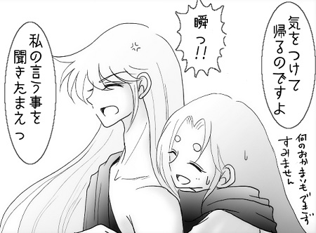 「僕らの戻る場所帰る場所」おまけ漫画 ご来訪・拍手ありがとうございます。まず遅くなってしまったのですが先日実施しておりましたアンケート、無事に終了しました^^思っていた以上にたくさんの投票を頂き、心より感謝しています。投票にご協力いただきました皆さま、本当に本当にありがとうございました!アンケートについては、また次に改めてご報告させていただきます^^*そしてこの週末。朧は某アテナ様とオフ会をいたしまして≧ω≦♪こちらも次にじっくりレポしたいなと思います≧ω≦ふふふふ♪そして、本日トップページに案内しておりますが、Gallery005に前回のキリ番の時に描いた「僕らの戻る場所帰る場所」のおまけ漫画をアップしました^^「僕らの~」でみんなが帰って行った場所でのお話も描いておきたくて描いたお話です。おまけ漫画といいながら結構なページ数になっちゃったのでお暇な時にでも覗いてもらえれば光栄です。今回のおまけ漫画は去年の瞬くんの誕生日に描いたおはなしとリンクしていますので読みながら「???」となるかもなんですが、その際はお手数ですが瞬くん誕漫画も目を通して頂けたら幸いです><;(こちら→)どぞよろしくお願いします。今回はちょっと長くなっちゃいますので、ちょっとたたみます^^ つづきはこちら [5回]