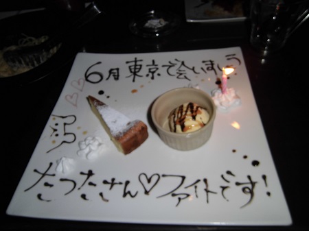 いっきしゅんかい♪ こんばんわ♪前回の日記で「また夜♪」といいながら、もう水曜日・・・毎度の事ながら仕事の遅い惰弱なやつです・・・><。。。すみません。前回にもちょっと書いてたのですが、先週末、朧はちょっと遠出をしてきました^^*そしてそして☆相互リンクで日頃お世話になっている「星唄綴り」の竜田姫様と春の一輝瞬会してきましたーーーー≧▽≦ノわー♪隠れ家的なお洒落なお店で、一輝瞬会♪夜ということもあって、お酒が入っての怒涛の一輝瞬トーーーク≧▽≦♪パラ銀の事なんかも話題にあがり、いろんなお話に華を咲かせてきました^ω^♪だいぶ前の日記に書いた友達に内祝い一輝瞬熨斗付のプレゼントを送った事があったけど、今回もやっちゃいました一輝瞬熨斗≧ω≦へへ☆(前回と同じ画像だけどこんなの) 「もう見飽きたよ」って思われるかドキドキだったけど、喜んでもらえたよかったです≧▽≦♪そして、本当にありがたい事に、竜田姫様からとっても素敵な誕生日プレゼントを頂いちゃいました^^私の大好きなツボをドストライクなプレゼントでとってもとっても嬉しかったです^ω^*♪長生きしてよかった・・・♪♪で♪こんな私にいつも楽しく優しく接して頂いている竜田姫様に朧的サプライズ決行~≧ω≦v♪ 6月にパラ銀でお会いしたいという願いと応援の気持ちを込めたデザートプレート^ω^♪お店の方にもとっても素敵な演出をしていただいて感謝感謝♪竜田姫様にも喜んで頂けてよかった*^^*♪こんな感じに盛り上がって盛り上がって盛り上がりすぎて、本当に時間があっという間に終わってしまったのだけど、話たりないし、私の野望もあったので、そのまま別のお店に移動~♪♪どこのお店に行こうかとぷらぷらと歩きながら、こことかどうですかねって入ったお店でまさかの奇跡がっっ≧▽≦☆なんと!一輝瞬カクテル発見!!! その名も「マジで恋する5日前」≧///≦☆今宵恋をさせますって・・・恋する5日前って・・・その5日間に兄さんと瞬くんの間にどんなドラマが起きるのさっっ!!って、小宇宙大爆発☆早速頼んでみたんですが、まさに一輝瞬・・・//▽//♡しかも!実際に来たカクテルが、兄さんの部分(青色)が光輝いてたんです≧▽≦☆ 見て楽しんで、飲んで美味しくて、大満足のカクテルでした≧ω≦♡チェーン店のお店なので、もし見かけた方いらしたら、ぜひ飲んでみてくださいませ^ω^♪そして美味しい一輝瞬頂きながら、スケブを描き描き♪竜田姫様のご了承を頂いたので、描いて頂いた一輝瞬お披露目(*^▽^*)♡平日は実家生活でスキャナがないので写メですみません・・・:; とっても素敵なラブラブ一輝瞬頂いちゃいましたっ( *´艸`)♡この密着具合♡大好きです//▽//♡こんなに素敵な一輝瞬頂いたのに、私の描いた一輝瞬は酔いちくれて線がいろいろあれで・・・本当に反省・・・:;笑顔で受取って頂いた竜田姫様は本当にアテナです////ホントに・・・酒は飲んでも飲まれるな・・・ですね・・・T▽T気を付けます・・・というわけで、ボリュームたっぷり萌えたっぷりの素敵な一輝瞬会でした≧ω≦♡竜田姫様にはお忙しい所、遅くまでお付き合いいただきまして本当に本当にありがとうございました≧▽≦♡酔っ払いの朧に愛想つかされてなければ、また一緒に飲みかわしたいです・・・・^///^♪ [0回]