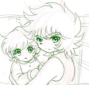 ちびいっきしゅん 今日、久々にビリヤードに行きたい衝動に駆られてるんですが。行きたいけどどうしようかな~とか考えながら仕事から帰ってたら帰宅中にふとビリヤードしている一輝瞬が湧いてきてモダモダしている朧です。゚+.* (*´I `*)ノシΩのシャツ兄弟がビリヤード・・・ってなんだか大人なカンジでよくないですか( *´艸`)??ウイスキーを飲みながら、二人でビリヤード・・・。照明が暗めのシックなカンジのビリヤード場とかいいなぁ・・・( *´艸`)そんなΩ一輝瞬ほしいです・・・。欲しいなら描けよって話ですね^^;描きたい気持ちはあるけれど、今週はいろいろ描き進めてるものもあるから、落ち着いたら描きたいな・・・・。今アリエス漫画もとりあえず3分の2を終えたところで、ちまちまとちび一輝瞬漫画とか手を付けてます^^*今回は新しいソフトを取り入れて、練習も兼ねて~なカンジなんですが。とはいうものの。新しいソフトをダウンロードしてみたんですが、今愛用しているソフトとかなり使い勝手が違ってとりあえず、いつものソフトでラフ描いてみたり・・・(すでに逃げてる・・・) 新しいソフトってなかなか覚えるの大変です・・・ね・・・T▽T仕上げだけでも新しいソフトで・・・と思っているので、次のちび一輝瞬漫画は今までのタッチとちょっと違うカンジになるかもです^^完成したらまたGalleryにアップしようと思いますので、よかったらその時は覗いてやってください♪そして、ちび一輝瞬の漫画を描きながら、新たにちび一輝漫画のお話が湧いてきて、それも描きたくて描きたくて、一人こじらせてます・・・>▽<;さすがにこれ以上中途半端な状況を作るのはまずいなと思い、すぐに描くのはあきらめたけどどうしても書いておきたかったシーンだけこないだちょっと描いてみました^^ こんな感じのちび一輝と一輝兄さんのお話。もちろん、ちび瞬ちゃんと瞬ちゃんも登場です^^*今のお話が落ち着いたら描きたいな・・・・というか、こうやってどんどん脱線するから、描こうとしてネームで終わってる長めのお話がごろごろフォルダに溜まってすすまないっていうね・・・私ってヤツは・・・もう・・・^^; [1回]
