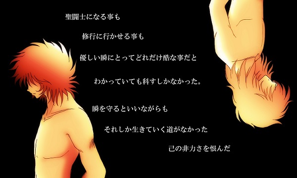 一輝兄さん誕☆ 一日遅刻してしまいましたが、なんとか一輝兄さん誕漫画完成しました(*^^*)♪トップページに案内しておりますが、Gallery005にアップしております(^^)♪併せてピクシブの方にも投稿させていただきました♪本当に、完成できてよかった・・・(T▽T)そして、間に合わないと弱音を吐いてた私に、エールを送っていただいて本当にありがとうございました!!皆さまのエールをもらってがんばることができました!!そして、アルデバランの彼にも、私のモチベーションがあがるようにと、スロット中に兄さんの画像を写メして送ってもらったり。みなさまにも彼にも心から感謝しています!!この場を借りて、本当にありがとうございました!!!そして今回はいつもの自分の悪い癖が災いしたなって痛感しています(:;)本当はお話を作るときにネームを仕上げてからとりかかるものなのだと思うのですが、私の場合、脳みその回転が悪くてすぐにネームが詰まってしまうもので(:;)いつもお話を描くときに、ネームで詰まってしまったところをとりあえず置いといて、できあがっているところをペン入れや着直をして具現化することで、ぼんやりとしていたネームのところができあがっていく感じで作っているんですよね。で、今回も同じようにしてたら、抜けていたネームのところができたまではよかったのですが、全部のパーツをつなげるとあまりにも話が重く暗くなりすぎてしまいまして・・・(TT;)最後の方がハッピーな内容としても、それでは足りないぐらいに気持ちが落ちちゃうなって思うぐらいに話が重たくなりすぎて、これはいかんと中盤を大幅にはっしょって修正した次第・・・。そして、遅刻と相成りました(T▽T)本当に兄さんごめんなさいでした。せっかく描いたので、ちょっとだけ、着色した分の没ページを公開・・・ こんな感じでホントはパンドラちゃんもだそうかとしておりました・・・。こんな風にやたら重たい話が続いてました・・・(^^;)今回、兄さんへの想いを詰め込もうと深堀していきながら改めて感じたのは兄さんもとても波乱万丈な人生を生きてきたのだなって思いました。普段、一輝瞬♪一輝瞬♪ってキャッキャ言ってる私だけど、2歳の頃から瞬君を守ってきた兄さん。守ろうとしてきた使命感や、孤児ゆえに己の非力さに悔しい思いもしてきたのだろうなと思うと、ブラコンとか言われるけど兄さんが瞬、瞬言うのも、それは本当に至極当然のことなのかもしれないなと・・・。今さら何言ってるの朧さんって思われてるだろうけど・・・(^^;)でも・・・。遅刻もしたし、いろいろと悩みながら修正したけれど、形にしたかったものができたので完成させれて本当によかったなって思います(*^^*)兄さん、今年もお祝いできたよかったよ♪♪来年もまたお祝いしようね♪♪ [0回]PR